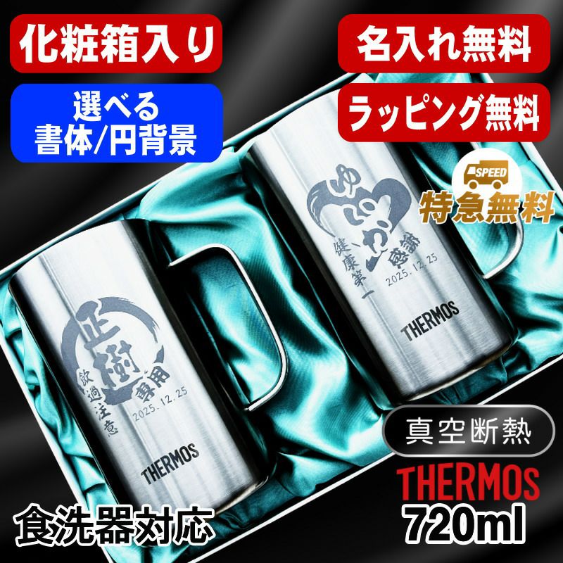 【 送料無料 ラッピング無料 特急対応無料 】 還暦祝い 古希 喜寿 傘寿 米寿 マーク変更可能です。ポイント消化 お誕生日 グッズ として ギフト に最適 ! 【化粧箱入り】サーモス真空断熱ステンレスジョッキ 720ml 名入れ無料 食洗器対応 ペアセット JDK-721 円背景 EH35