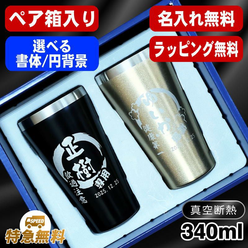 【 送料無料 ラッピング無料 特急対応無料 】 還暦祝い 古希 喜寿 傘寿 米寿 マーク変更可能です。ポイント消化 お誕生日 グッズ として ギフト に最適 ! 【ペア箱入り】真空断熱タンブラー 350ml 名入れ無料 黒 金 ペアセット 円背景 EH13