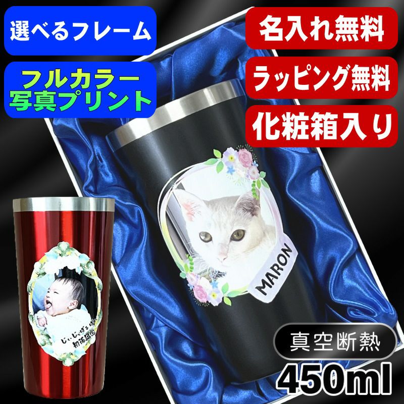 【 送料無料 ラッピング無料 】 ペット うちの子 写真 オリジナル グッズ 犬 猫 ペットオリジナルグッズ プリント 印刷 誕生日 記念品 ギフト に最適 ! 【化粧箱入り】真空断熱タンブラー 450ml 黒 赤 写真プリント PSYN-2